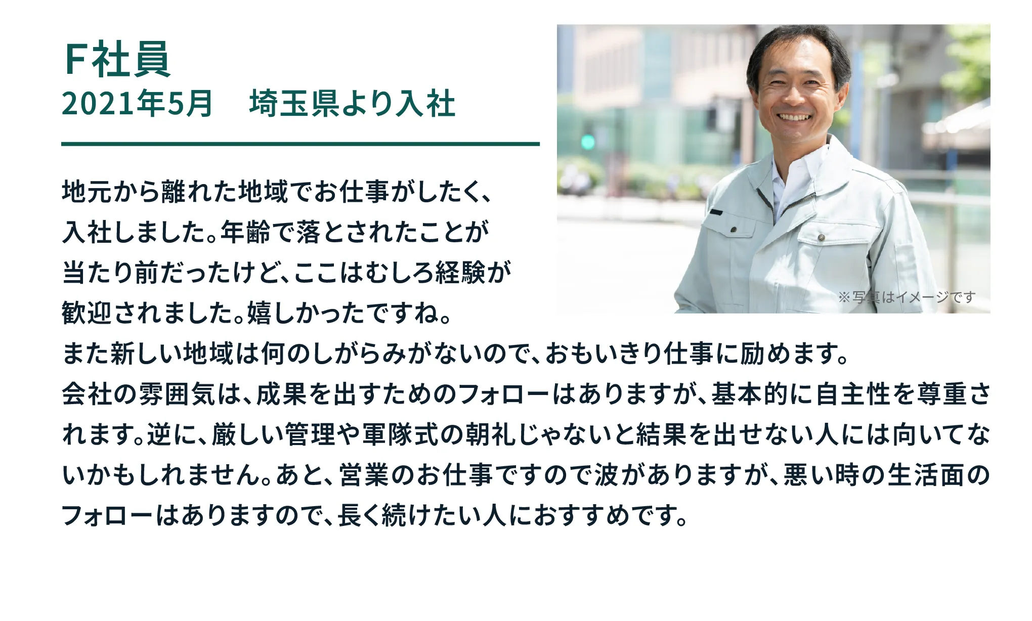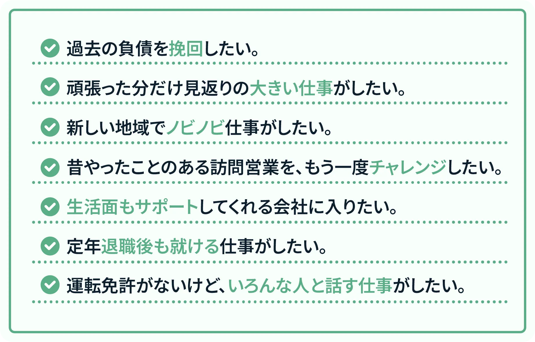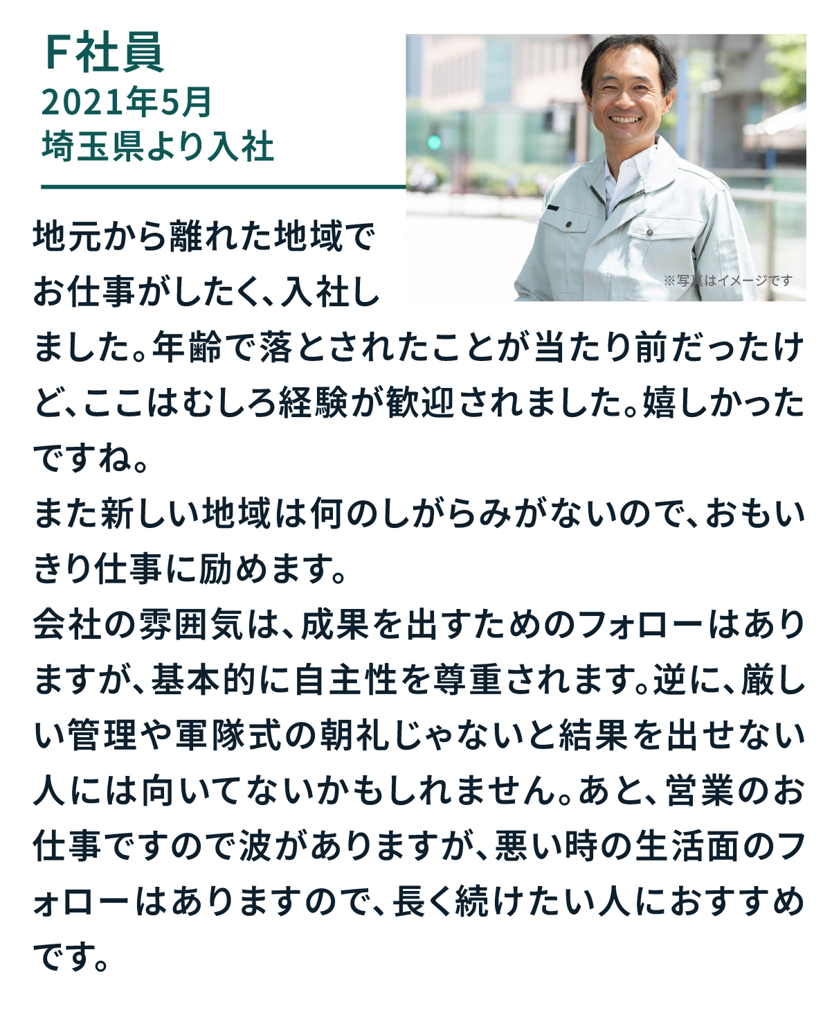 むしろ、お客様の多くが50代以上の方。 人生経験があるあなたの"聞く力"や"話す力"が 活かせる場面が多いのです。 そして、私たちが募集しているのは、 いきなり売り込む"押し売り営業"ではありません。 まずはアポインターとして、お客様のニーズを聞き提案し、 先輩社員につなぐのがスタートです。 2人で1契約をとる営業なので、未経験でも安心です。